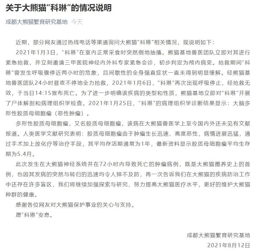 2021年1月3日,“科琳”在室内正常采食时突然倒地抽搐。熊猫基地兽医团队立即对其进行紧急抢救,并立刻邀请三甲医院神经内外科专家紧急会诊,初步判定为颅内病变。抢救期间“科琳”曾发生呼吸骤停近两小时的危象,且间歇性的全身强直症状一直未得到明显缓解。经熊猫基地兽医团队24小时昼夜不停地全力抢救,2021年1月6日,“科琳”再次出现呼吸停止,经抢救无效,于当日14:15宣布死亡。为了进一步明确该疾病的类型和性质,熊猫基地立即对“科琳”开展了尸体解剖和病理组织学检查。2021年1月25日,“科琳”的病理组织学诊断结果显示:大脑多形性胶质母细胞瘤(恶性肿瘤)。