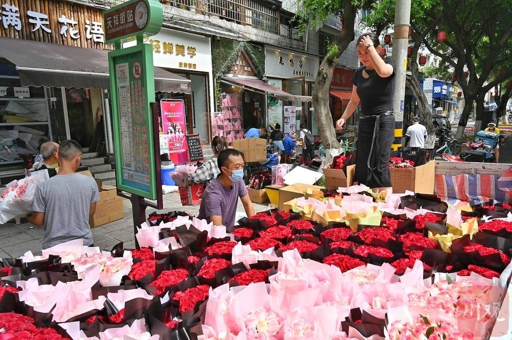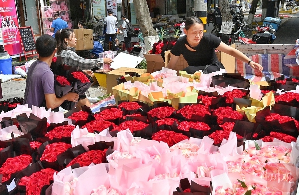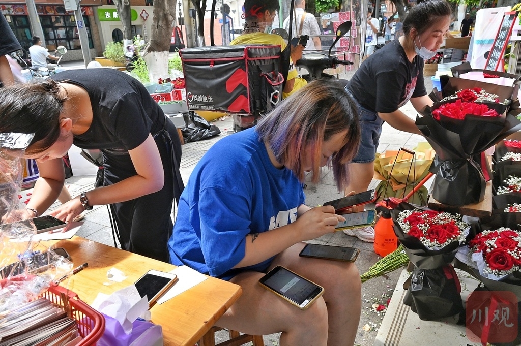 8月13日农历七月初六,传统七夕节的前一天,成都天祥街的一家花艺店一大早就开始忙碌起来。四川在线记者在现场看到,花店门前一张小桌上7部手机排开,屏幕都不停闪烁着收到新信息的提示。“早上8点就坐这儿接电话,开始接单、发单,昨天已经到了几车鲜花,今晚上又会是一个通宵。”店员糖糖对记者说。