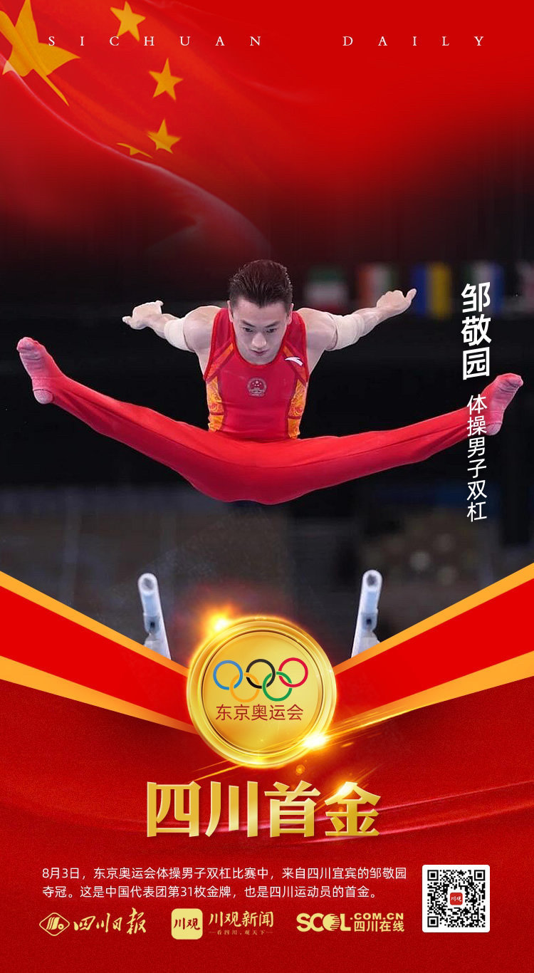 在8月3日下午进行的东京奥运会体操男子双杠比赛中,第二位出场邹敬园动作难度分6.9分,完成分高达9.333分,最终以16.233分力压群雄稳稳夺冠。这是中国体育代表团在本届奥运会的第31枚金牌,也是四川运动员在本届奥运会夺得的首枚金牌。堪称“地表最强双杠”的邹敬园也因此成为宜宾首位奥运冠军。