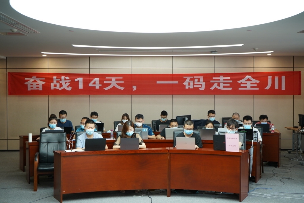 “奋战14天,一码走全川。”8月13日,武侯区天府一街,一条红色横幅挂在四川省大数据中心的大工作间。魏冯 摄