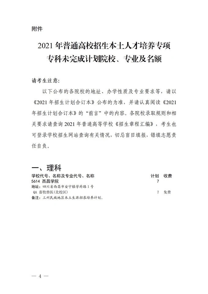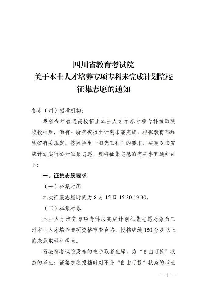 8月15日,记者从省教育考试院获悉,四川将对本土人才培养专项专科未完成计划进行院校征集志愿,时间为8月15日15:30至19:30。详情如下:
