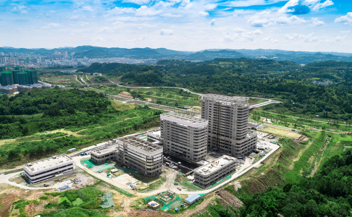 8月11日,在距离南充市仪陇县人民医院不到两公里处,正在修建的仪陇县医疗中心建设现场,工人们正忙着给门诊大楼铺设隔水层,安装了部分铝制外墙的医疗中心颇具现代科技感。