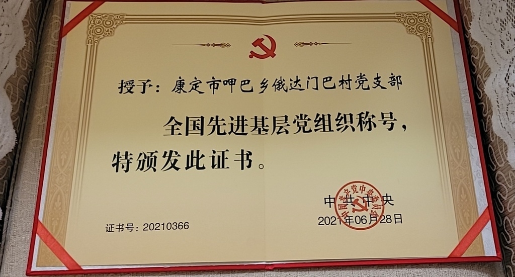 俄达门巴村“全国先进基层党组织”荣誉证书
