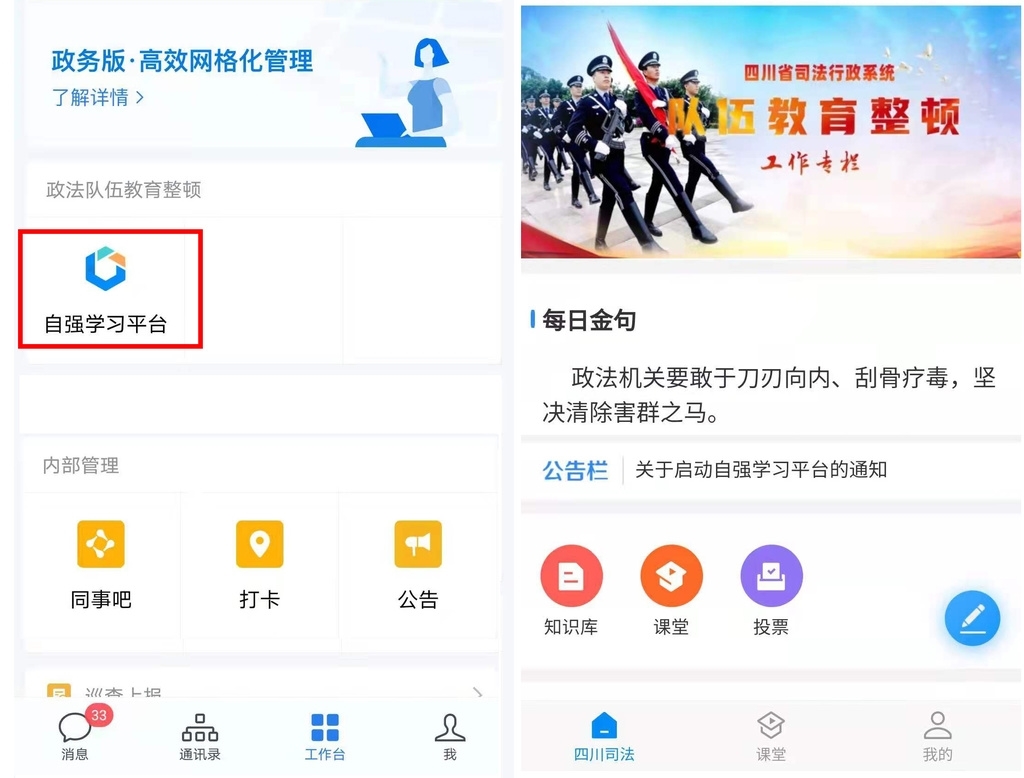 8月16日,四川在线记者从省司法厅获悉,为抓牢抓实队伍教育整顿学习教育,提高学习质效,省司法厅创新开设线上“自强学习平台”,解决在线学习问题,为干警职工随时学、随手学、随处学提供条件,做到学习教育全覆盖,努力实现学习教育一张网、全体人员一个群、规定篇目一起学、应知应会一同考,该平台将于明日正式上线。