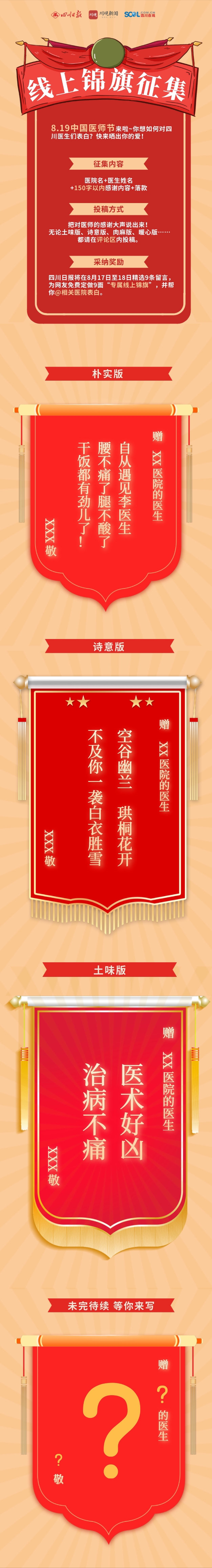 8月17时至18日,我们将从网友的评论中评选出:最温柔的、最诗意的、最感人的、最幽默的、最搞怪的、最魔性的、最有爱的、最土味的、最朴实的、最疯狂的、最可爱的、最肉麻的.......(不限于以上),精选不少于9条留言,为网友免费定做不少于9面“专属线上锦旗”,并帮你@相关医院表白。