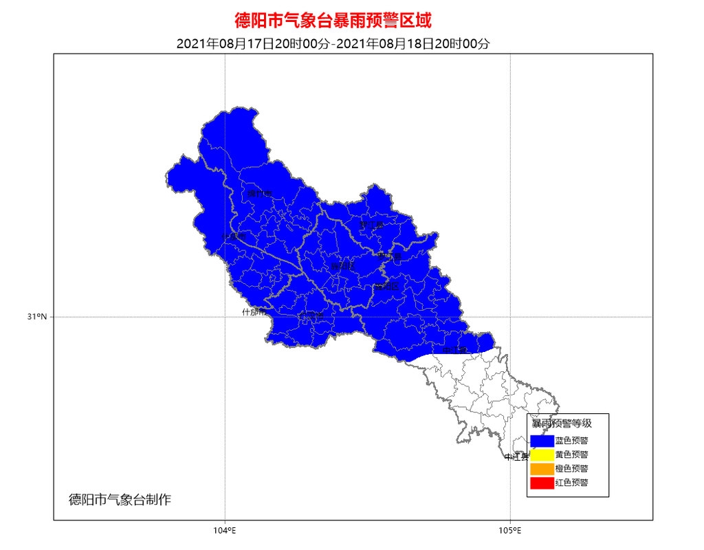 继16日发布暴雨预警后,8月17日16时,德阳市气象台继续发布暴雨蓝色预警:今天晚上到明天白天,德阳市中西部地区(绵竹、什邡、旌阳、广汉、罗江和中江的西部)有大雨到暴雨(雨量30至60毫米),个别地方大暴雨(雨量100至140毫米),最大小时雨强20至30毫米,其余地方以中雨为主,局地大雨(雨量10至30毫米)。