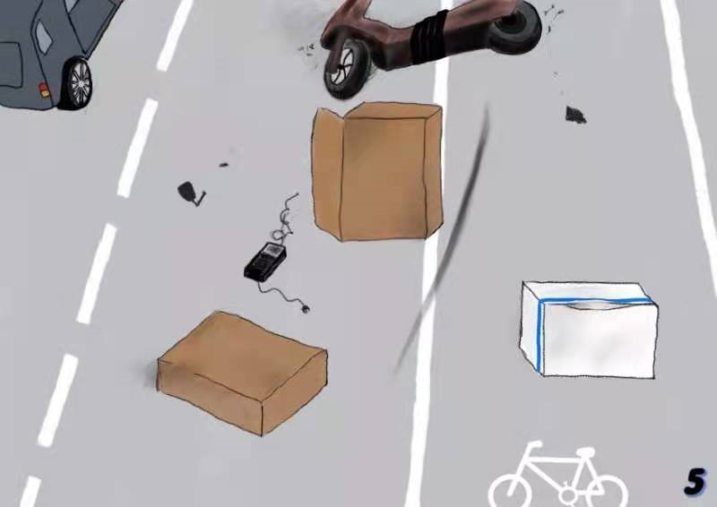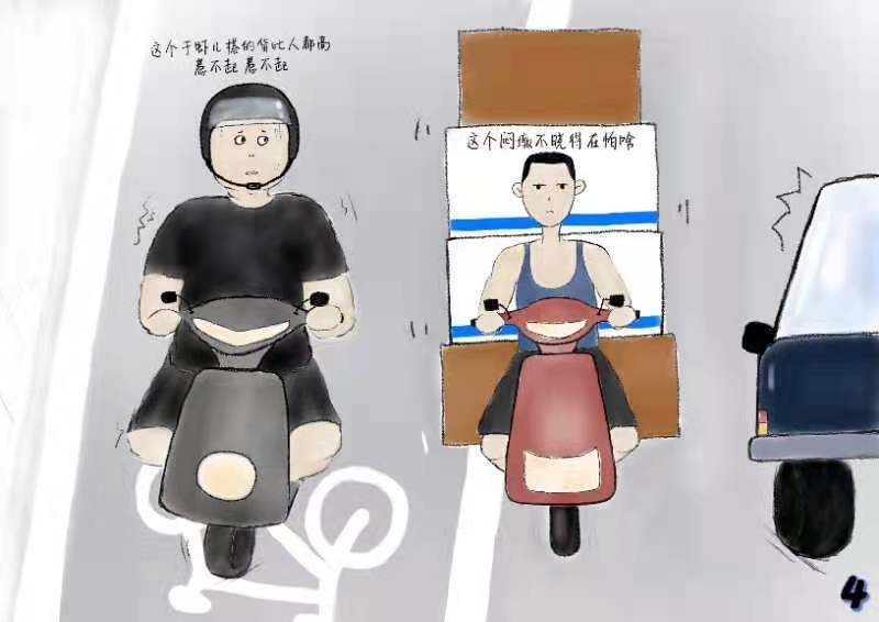 电动自行车灵活、便捷,是外卖、快递等行业的重要交通工具,但同时电动自行车的各类交通违法乱象也日益突出,其中部分是从事外卖、快递的小哥。针对部分电动自行车驾驶人的年龄结构和工作特点,交警二分局文职辅警唐薇创作了一组漫画“帅锅,你慢点!”。漫画描述了一位电动自行车驾驶人,超载货物,在道路上做出了一系列违反交通法规的行为,对其他的交通参与者构成安全隐患,同时自己也因不遵守交通法规造成了危害后果。