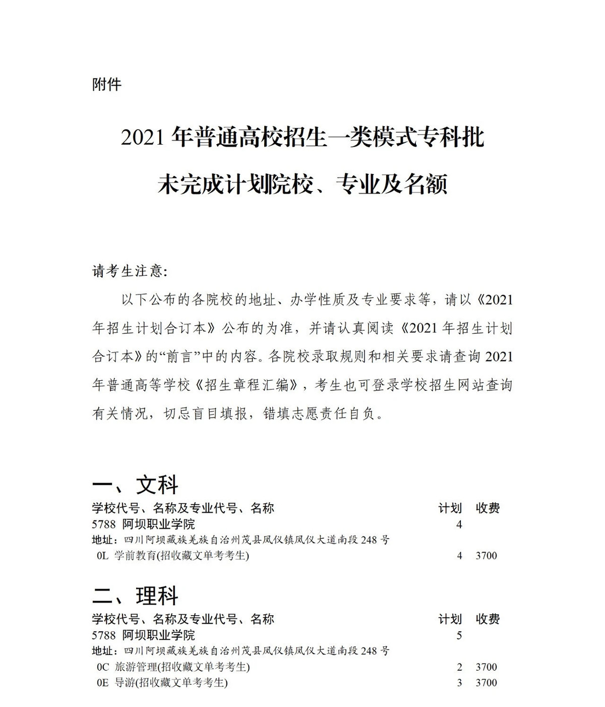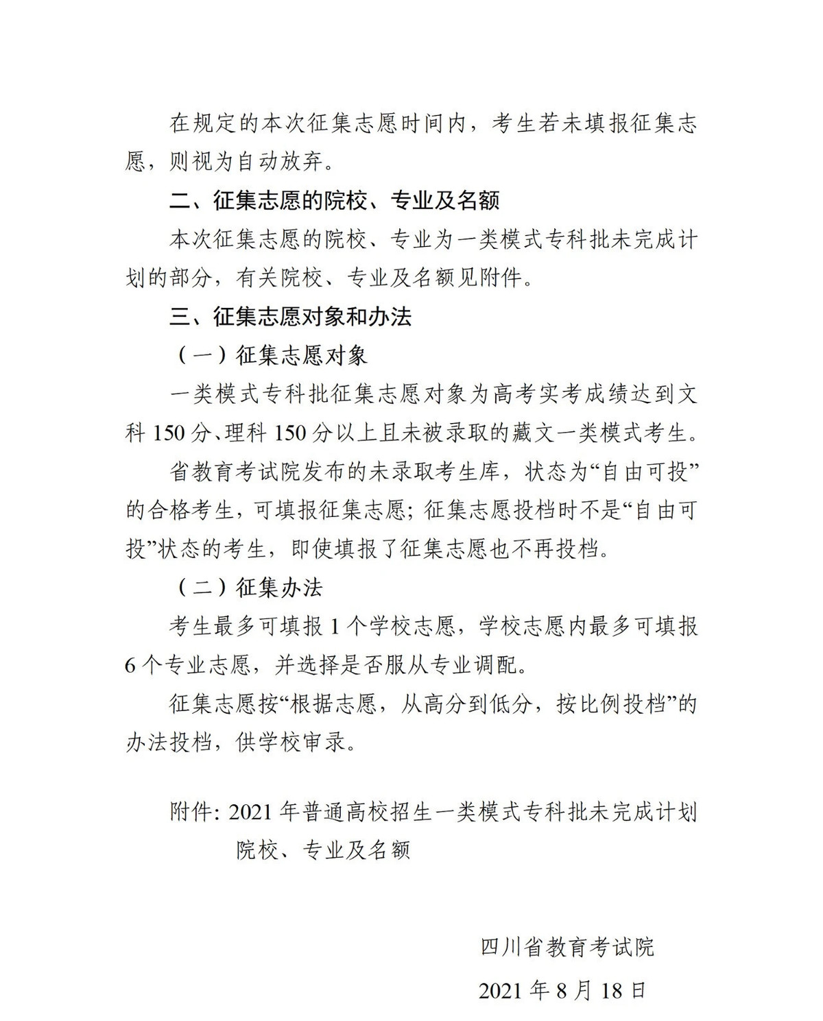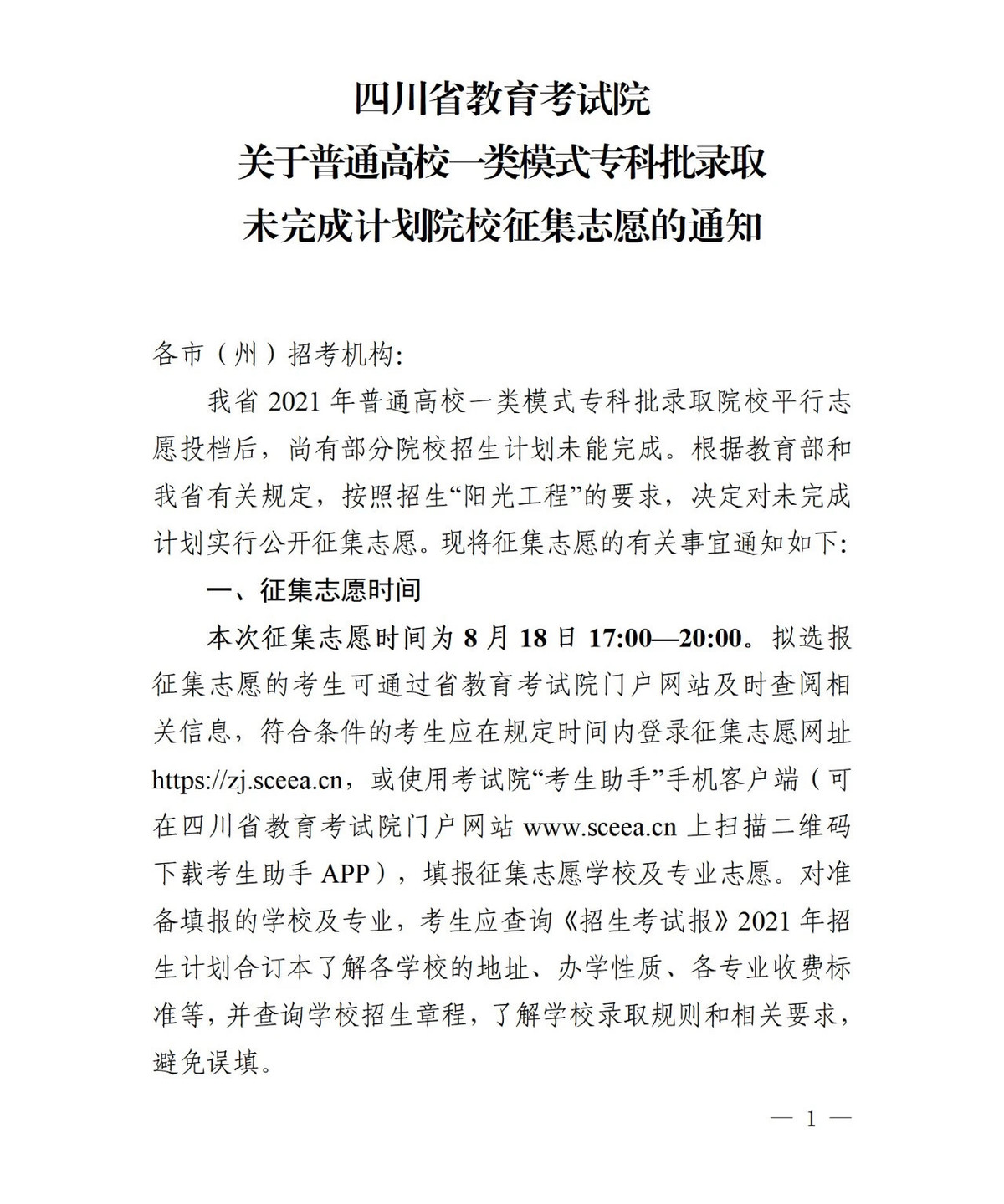 8月18日,记者从省教育考试院获悉,四川决定对一类模式专科批录取未完成计划进行院校征集志愿,时间为8月18日17时至20时,详情如下: