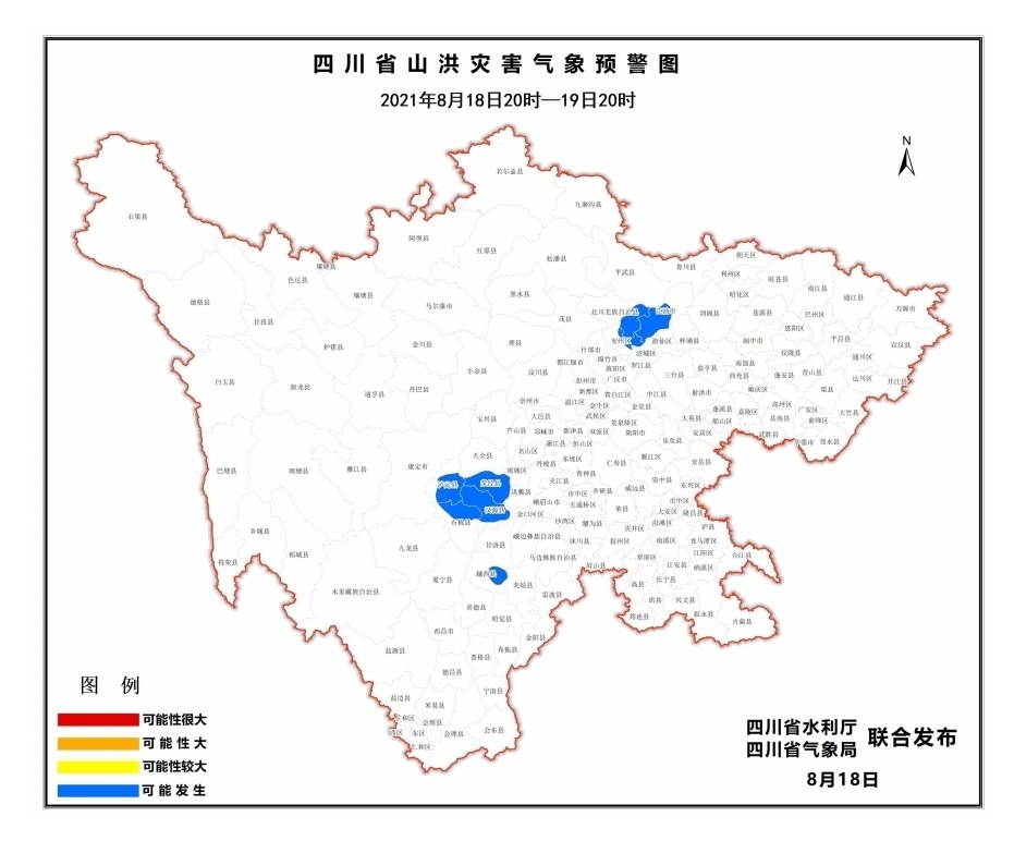 8月17日17时30分,四川省水利厅、四川省气象局联合发布山洪灾害蓝色预警。8月18日20时至19日20时,安州、江油、北川、荥经、汉源、石棉、泸定、越西等县(市、区)可能发生山洪灾害。