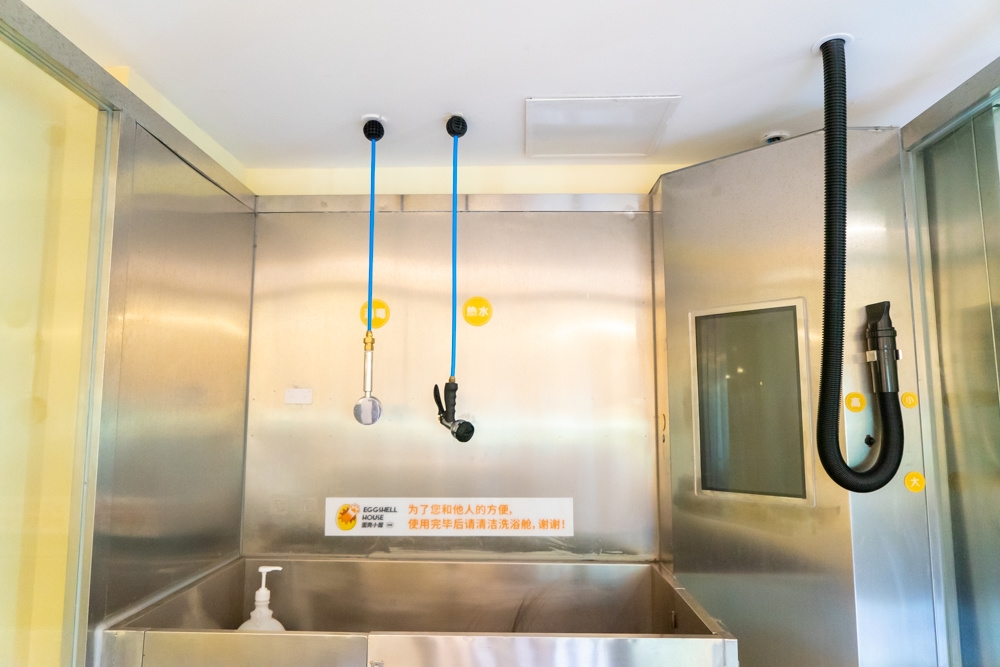 走进店内,在约50平方米的洗宠店内,有两个自助洗浴舱,舱内有洗浴池、吹干台、吹干机等设施,只需按照步骤扫描洗浴舱前的二维码就可以自动开门进入。值得一提的是,在自助洗浴舱内也设计了很多“小心机”,两大喷头,长度随意调节,一个消毒用,一个洗浴用。恒温水龙头,随时调节水温,淋浴头也有六种模式... 为了让消费者了解自助洗宠流程,店内墙面上张贴有洗宠流程图,洗浴舱内也有洗宠教程循环播放,以便消费者学习。