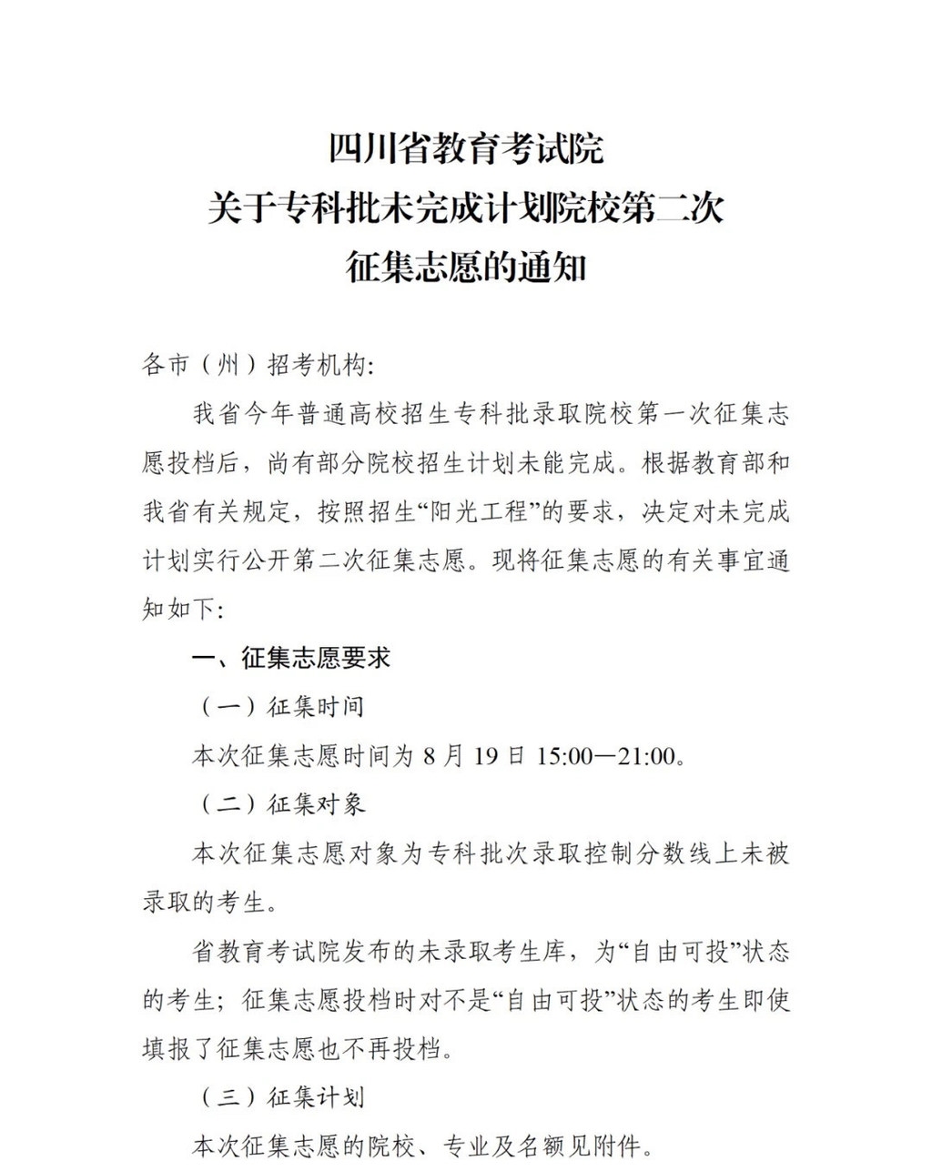8月19日,记者从省教育考试院获悉,四川决定对专科批未完成计划院校进行第二次征集志愿,时间为8月19日15:00至21:00,详情如下: