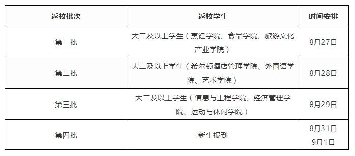学生返校时间为8月27日、28日、29日三天,新生报到时间为8月31日、9月1日,符合返校条件的学生报辅导员同意后按地域、年级、学院等分批次返校。