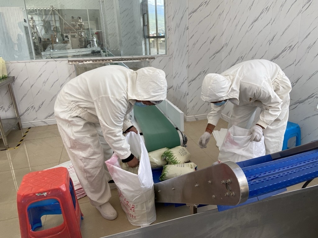青稞产业园仓库中的青稞面中的工人正在装袋