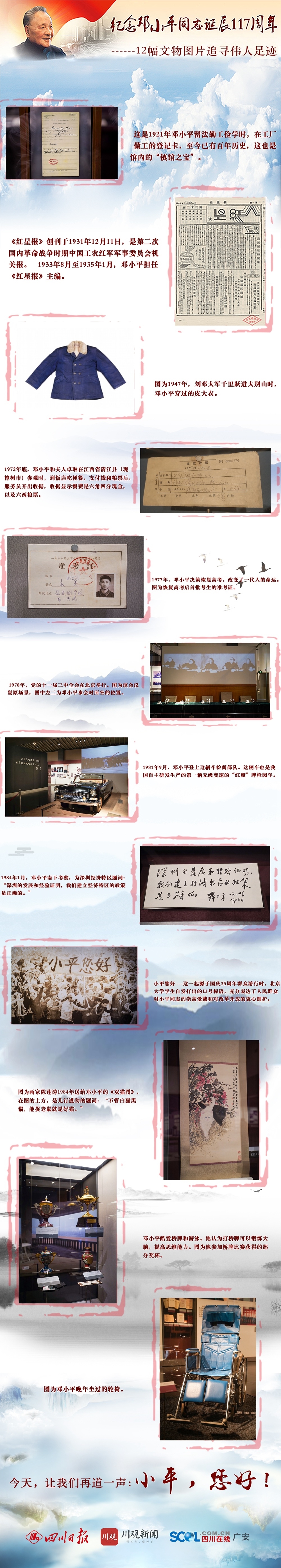 近日,四川在线记者走进邓小平故居陈列馆,用一组馆藏文物图片海报追寻伟人足迹,纪念伟人诞辰。