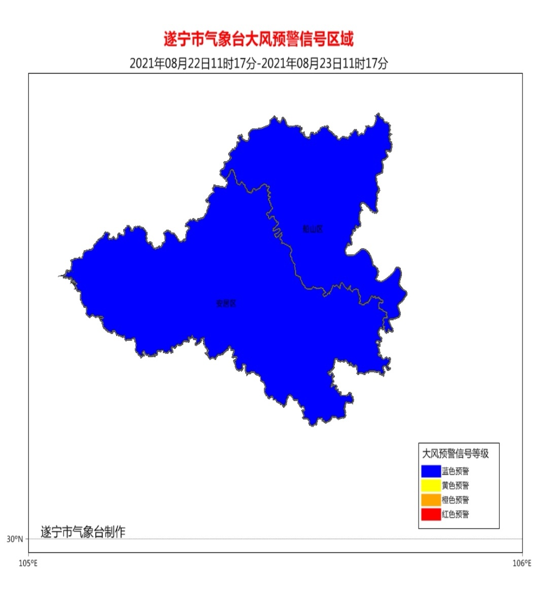 8月22日11时17分,遂宁市气象台发布第35号大风蓝色预警信号: