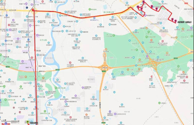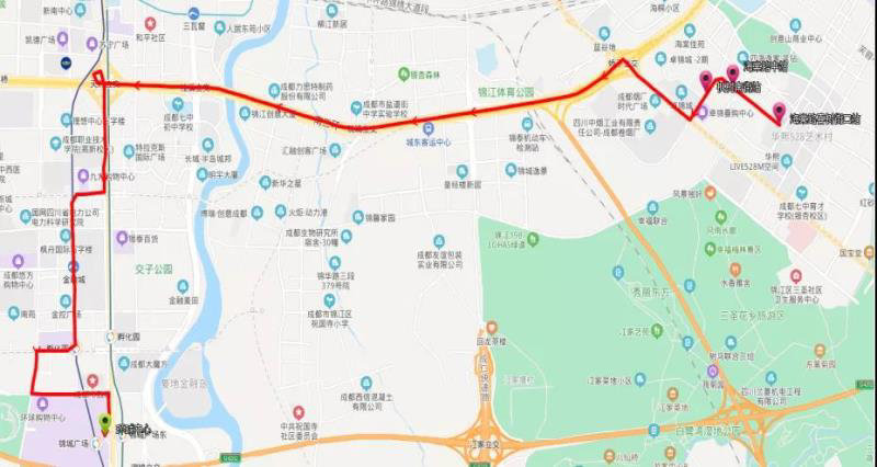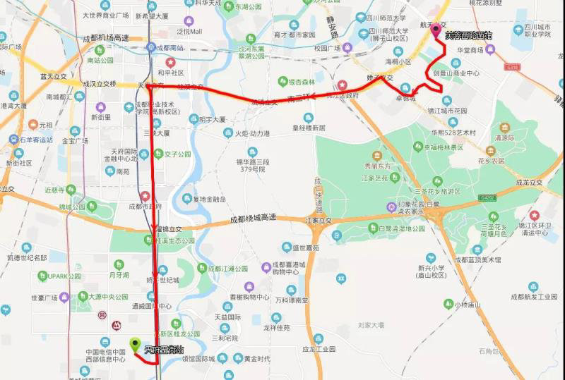 站点设置:星雅俊园(虚拟点)、龙湖天璞(虚拟点)、锦江城市花园站、牡丹街东站、牡丹街站、红豆树街牡丹街口站、国香街西站、国香街中站、环球中心站、地铁世纪城站、天府大道中段中站、地铁天府三街站、天府软件园站、地铁天府五街站、天府五街站。