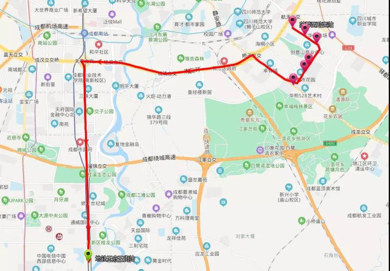 线路走向:星雅俊园(虚拟点)出发经牡丹街,(右转)喜树街、(左转)百日红中路、(左转)锦江大道、(右转)牡丹街、(左转)红豆树街、(直行经)国香街、(右转)枫树街、(右转)成龙大道、(左转)三环路辅道、(直行经)三环路、(左转)天府大道、(直行经)天府大道、(右转)天府五街,行至天府五街站。