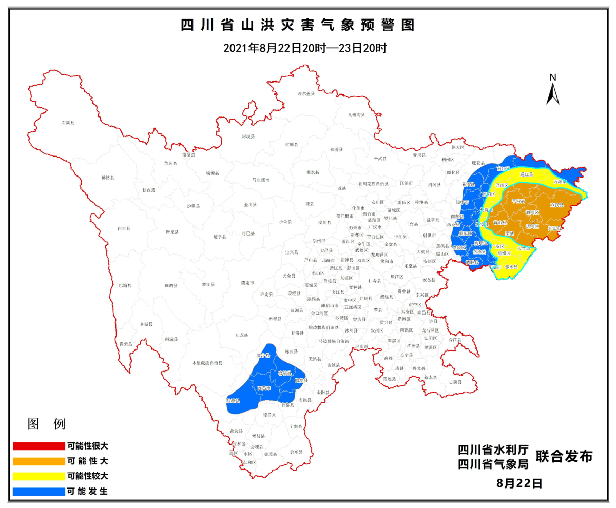 8月22日17时,四川省水利厅、四川省气象局联合发布山洪灾害橙色预警。预警显示,8月22日20时至23日20时,通川、达川、宣汉、开江、万源、大竹、渠县、巴州、平昌、通江、仪陇、营山等县(市、区)发生山洪灾害可能性大(橙色) ;广安、前锋、邻水、华蓥、恩阳、南江、蓬安等县(市、区)发生山洪灾害可能性较大(黄色);西昌、冕宁、盐源、喜德、昭觉、普格、武胜、岳池、嘉陵、高坪、顺庆、西充、南部、间中、苍溪、旺苍等县(市、区)可能发生山洪灾害(蓝色)。