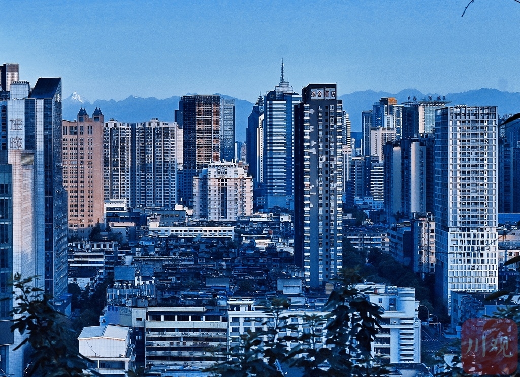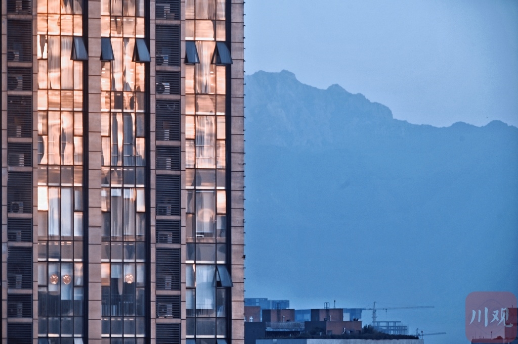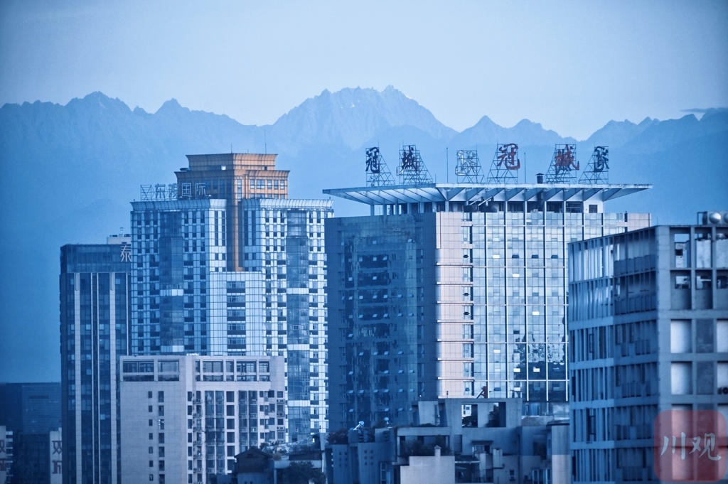 8月23日农历处暑,秋天正式到来,登高临风略感凉意。清晨,经过昨夜大雨的洗刷,成都市区的空气清透亮丽,极目远眺,视野极其辽远,远在百公里远的四姑娘山幺妹峰及山峦起伏的大雪塘清晰可见,似乎近在眼前,如此美景让观看者惊叹喜悦不已。