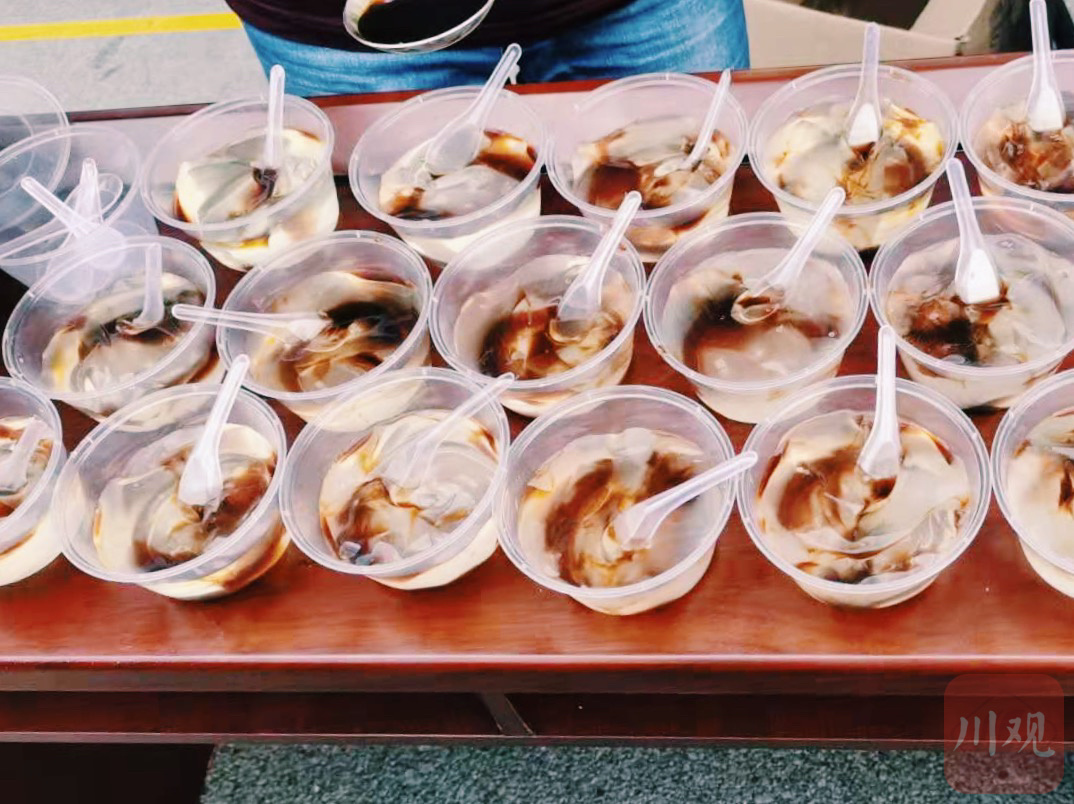 经过几轮强降雨后,近几日,泸州再次迎来热浪,多地气温超过30摄氏度。为保障良好的接种环境,沙坪社区接种点特意准备了冰粉、凉茶等“冰镇”小吃为大家消暑。“冰粉是街道食堂厨师手工搓的,红糖是自己熬的,够一两百人吃。我们还泡了菊花茶、苦丁茶等消暑饮品。大热天的,群众来接种疫苗不容易,服务工作一定要跟上。”黄永福说。