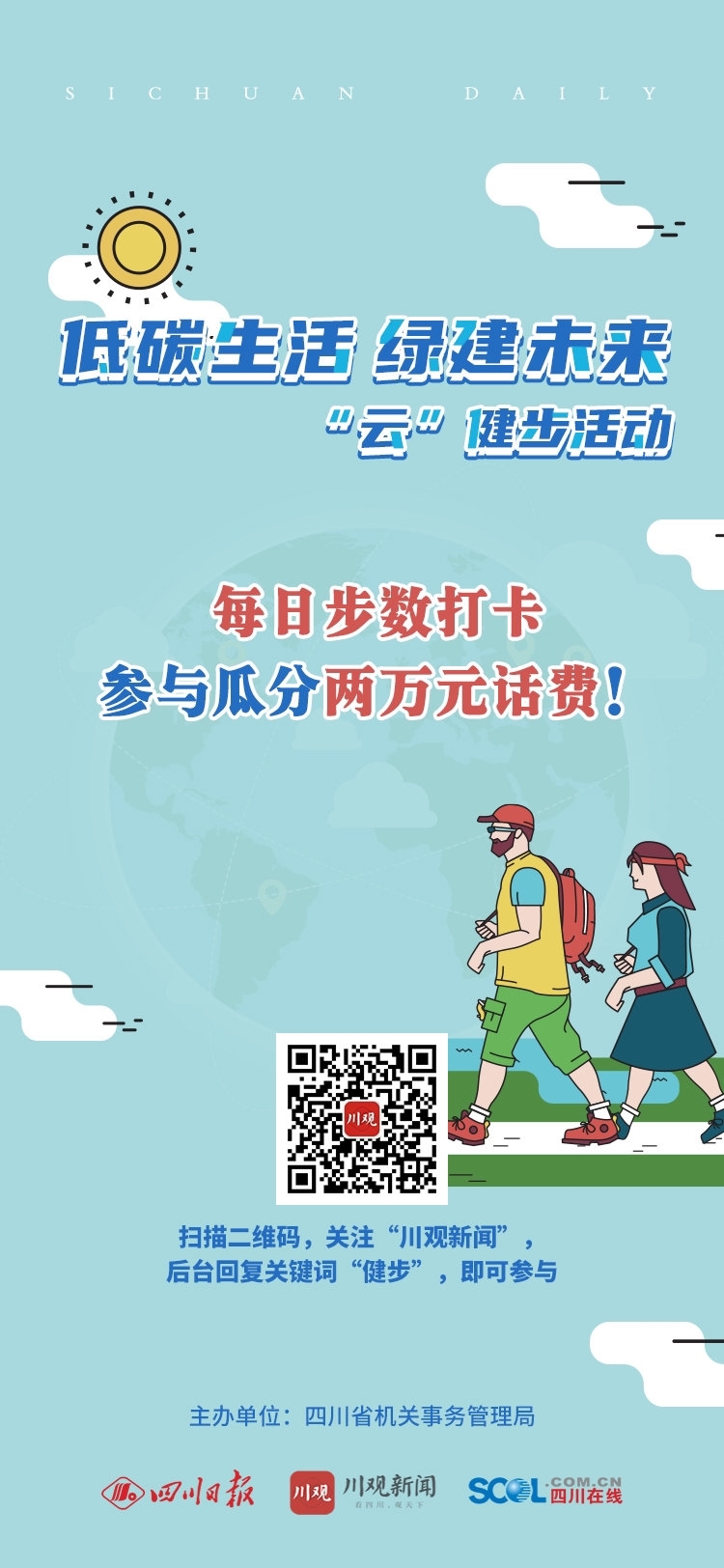 2021年8月25日——9月8日,四川省机关事务管理局与川观新闻共同推出“低碳生活 绿建未来——‘云’健步活动”,参与者通过每日步数打卡可获取话费福利。活动鼓励大家多走路、多锻炼、行低碳、做环保,以此强调节能环保的重要性,普及低碳环保新生活方式。