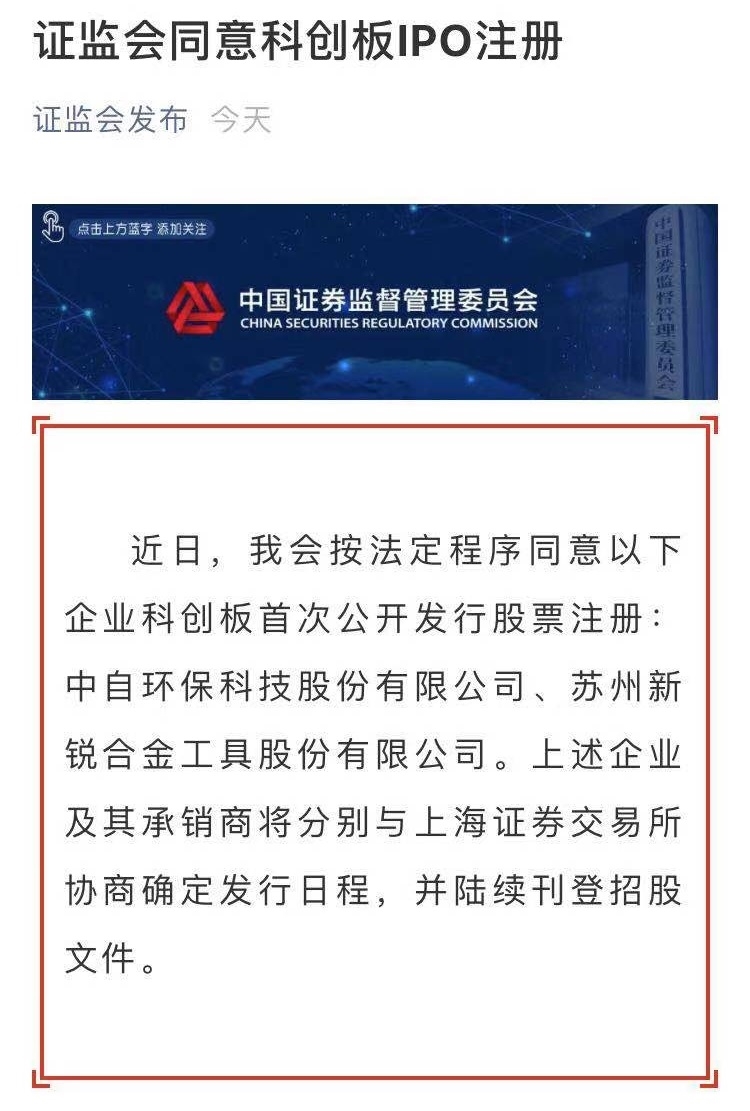 8月24日晚间,证监会发布消息,称按法定程序同意四川企业中自环保科技股份有限公司科创板首次公开发行股票注册,公司及其承销商将与上海证券交易所协商确定发行日程,并刊登招股文件。