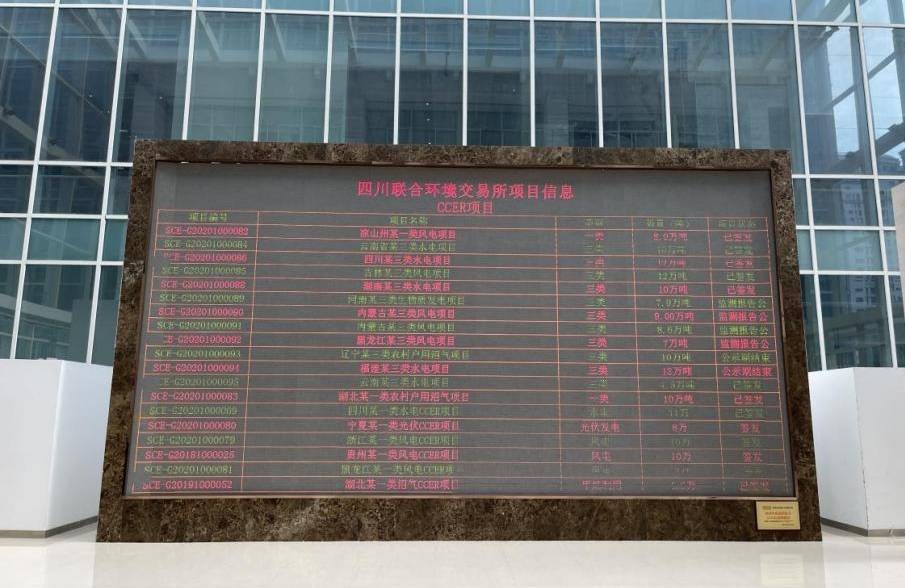 8月20日上午,成都市高新区天泰路120号,四川联合环境交易所(以下简称四川环交所)交易大厅内,一块巨大的电子屏幕不断滚动翻新,来自20多个省市区超过50个CCER(国家核证自愿减排量)项目正在挂牌交易,类型覆盖风电、水电、光伏发电等。