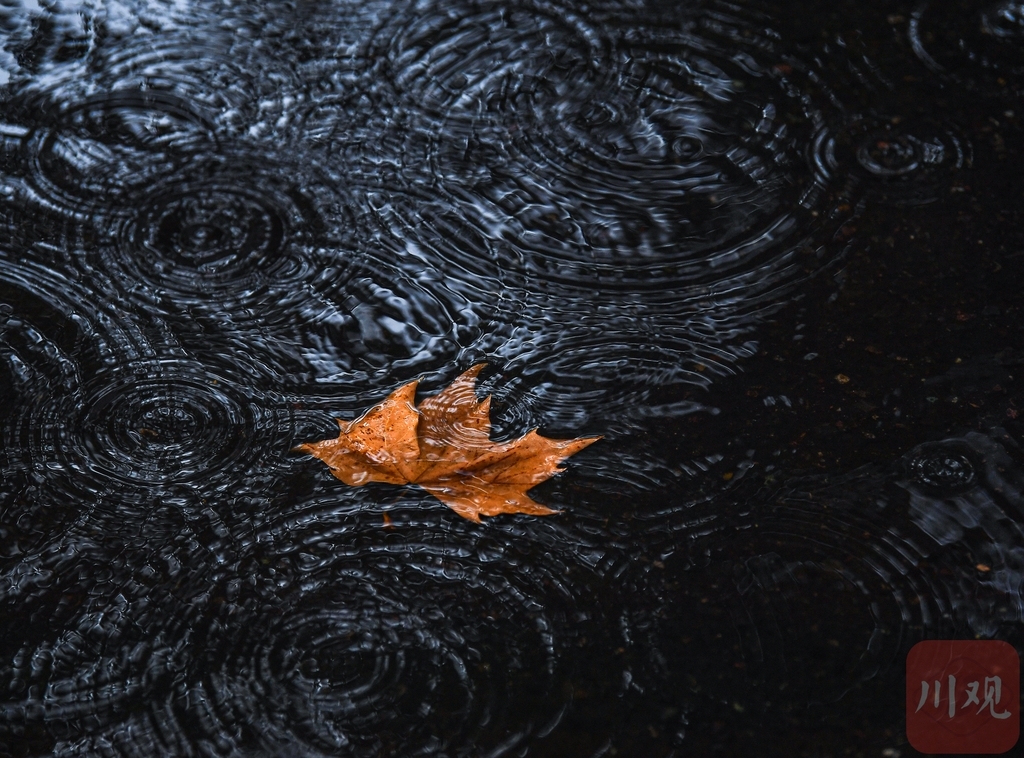 雨滴在水中的落叶周围溅起圆圈。