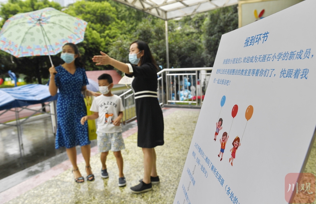 8月25日,在成都市天涯石小学,一名一年级新生(中)在家长的带领下来到学校报到注册。