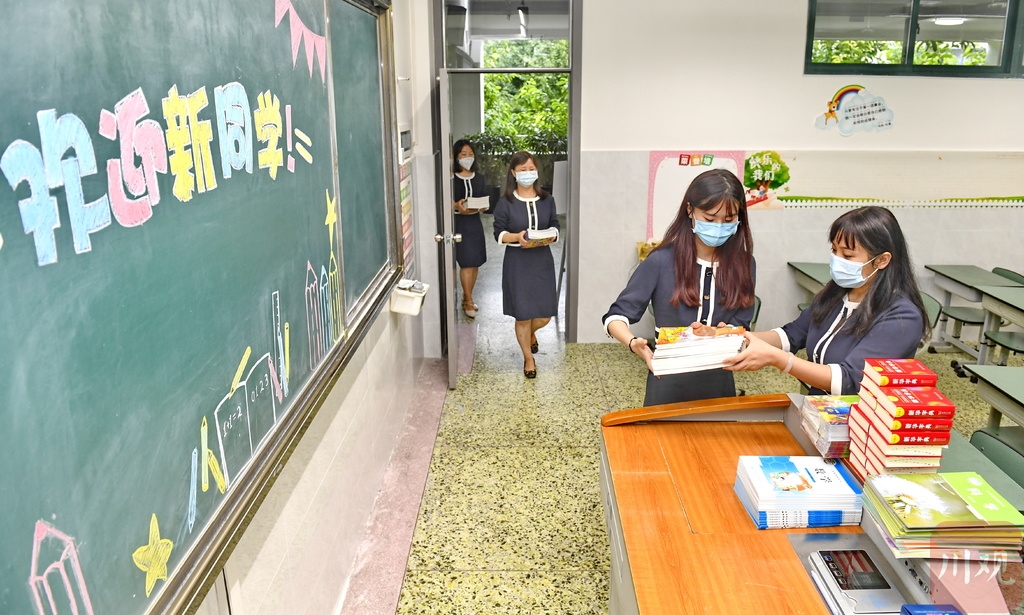 8月25日,在成都市天涯石小学一年级,老师们准备开学为一年级新生发放的新书。