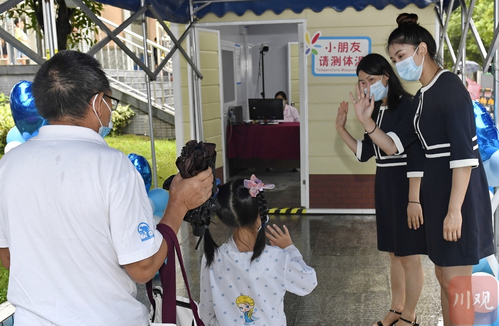 8月25日是成都市天涯石小学一年级新生报到的日子。在经历手消、测体温、扫健康码后,一个个稚嫩的小朋友牵着家长的手走进校园,开启了自己小学生涯“第一课”。