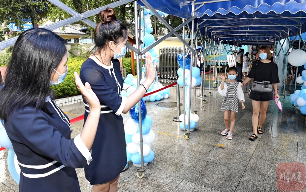 8月25日,在成都市天涯石小学,家长带着孩子到学校报到注册,老师门口迎接每一名入校新生。