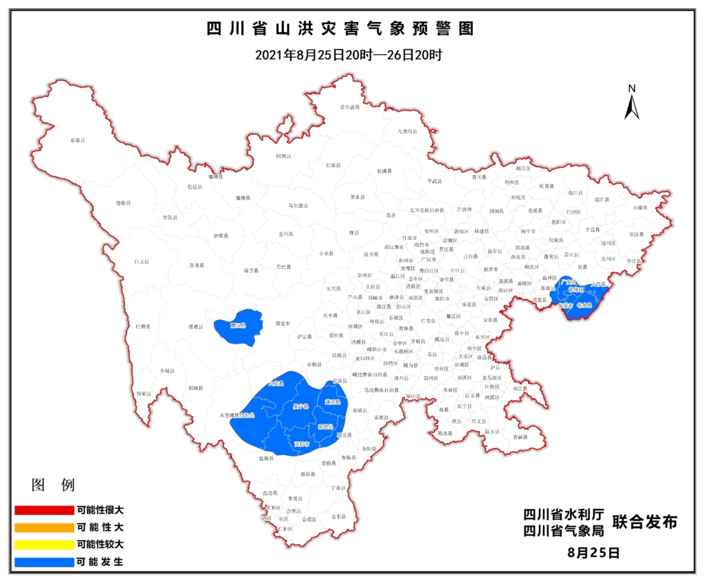 8月25日17时,四川省水利厅、四川省气象局联合发布山洪灾害蓝色预警。8月25日20时至26日20时,大竹、广安、前锋、岳池、华蓥、邻水、雅江、九龙、木里、冕宁、甘洛、越西、喜德、昭觉、西昌、盐源等县(市、区)可能发生山洪灾害。
