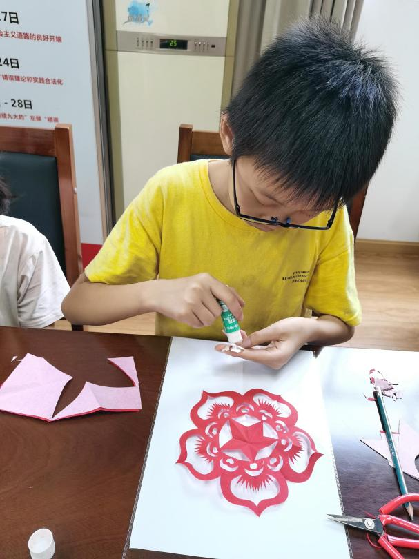 活动开始前,熊老师将自己创作的“热烈庆祝中国共产党成立100周年”剪纸作品进行展示。随后在熊老师的带领下,孩子们开始了探索剪纸工艺奥秘的神奇之旅。跟着老师一步一步的学习五面对称图形的制作流程及技巧,在掌握了“折、画、剪”的小窍门之后,呈现出了第一份作品——“五角星”。红色的“五角星”在形态各异的团花簇拥下闪着光芒,中间贴上黄色的党旗图案,这样的剪纸作品别具特色。
