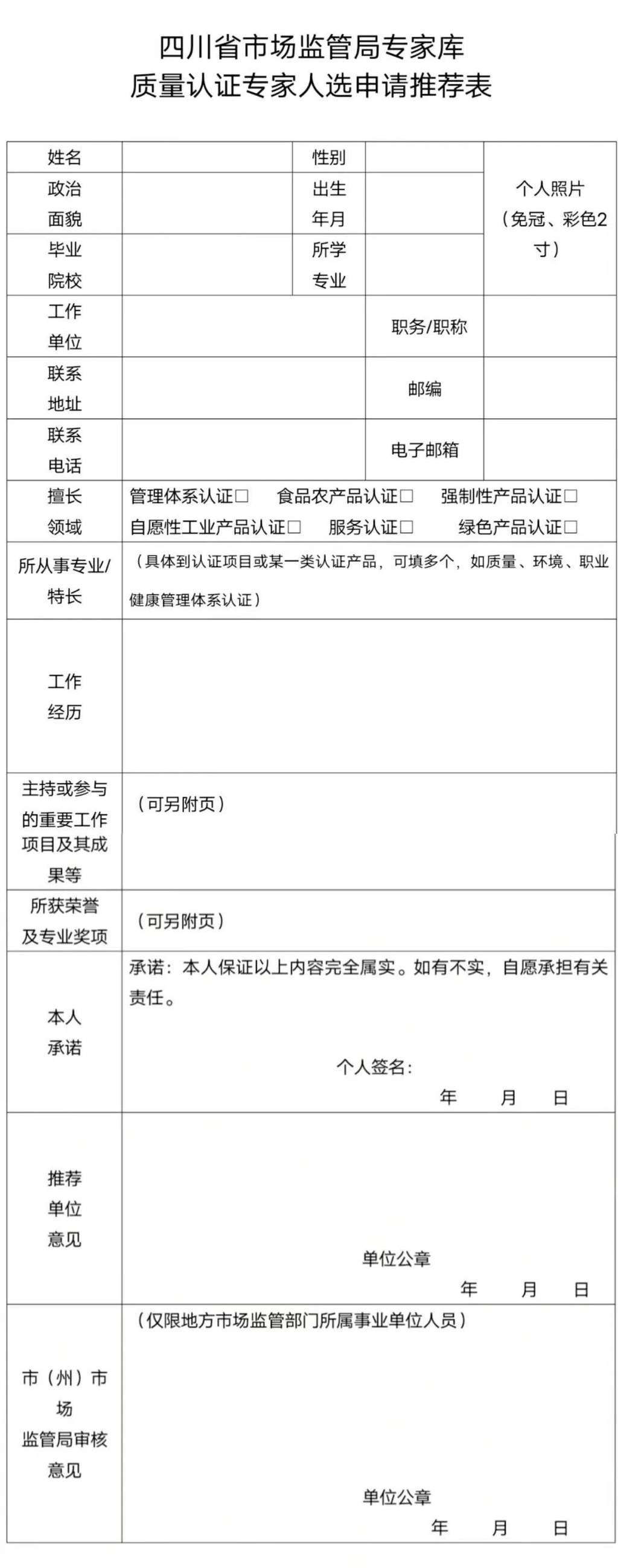 2.申请人需如实填写《四川省市场监管局专家库质量认证专家人选申请推荐表》(详见附件,以下简称申请推荐表),并需所在单位审核推荐。申请人如是地方市场监管部门所属事业单位的人员(含退休人员),还需所在辖区的市(州)级市场监管局审核推荐。