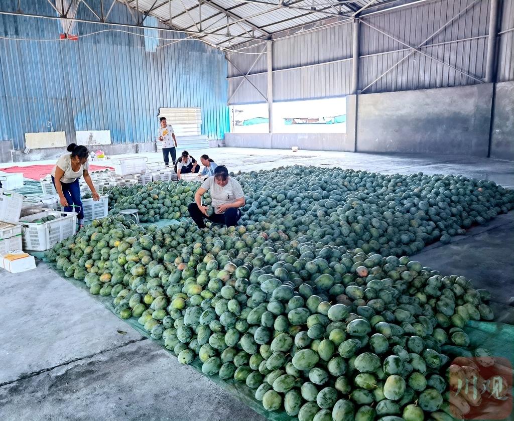 不远处,一排由蓝色彩钢瓦搭建的房屋,是由废旧厂房改建的内销农产品分拣中心。开仓一周多时间以来,已帮助村民销售50余万斤芒果,销往北京、大连、沈阳等地。“统一品牌,配套建设仓储分拣、深加工场地,整合资源拓宽销售渠道,最大程度保障农户收益。”银江镇相关负责人说。
