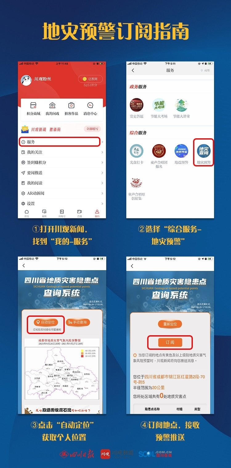 8月25日,四川日报川观新闻与四川省自然资源厅联合开发的四川省地质灾害隐患点查询系统升级为全新的3.0版本。相比过去被动查询,新升级的版本可以定义常用地点,实时接收最新的地灾预警。一句话:我们推送的就是您最关心的。