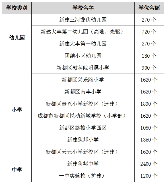 8月27日,四川在线从新都区教育局获悉,9月开学,新都将投用4所新建幼儿园,10所新(改、扩)建中小学,新增学位16740个。具体新增名单和学位分配如下: