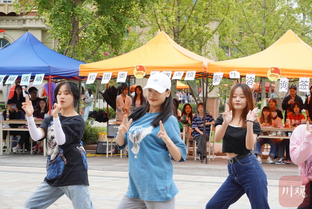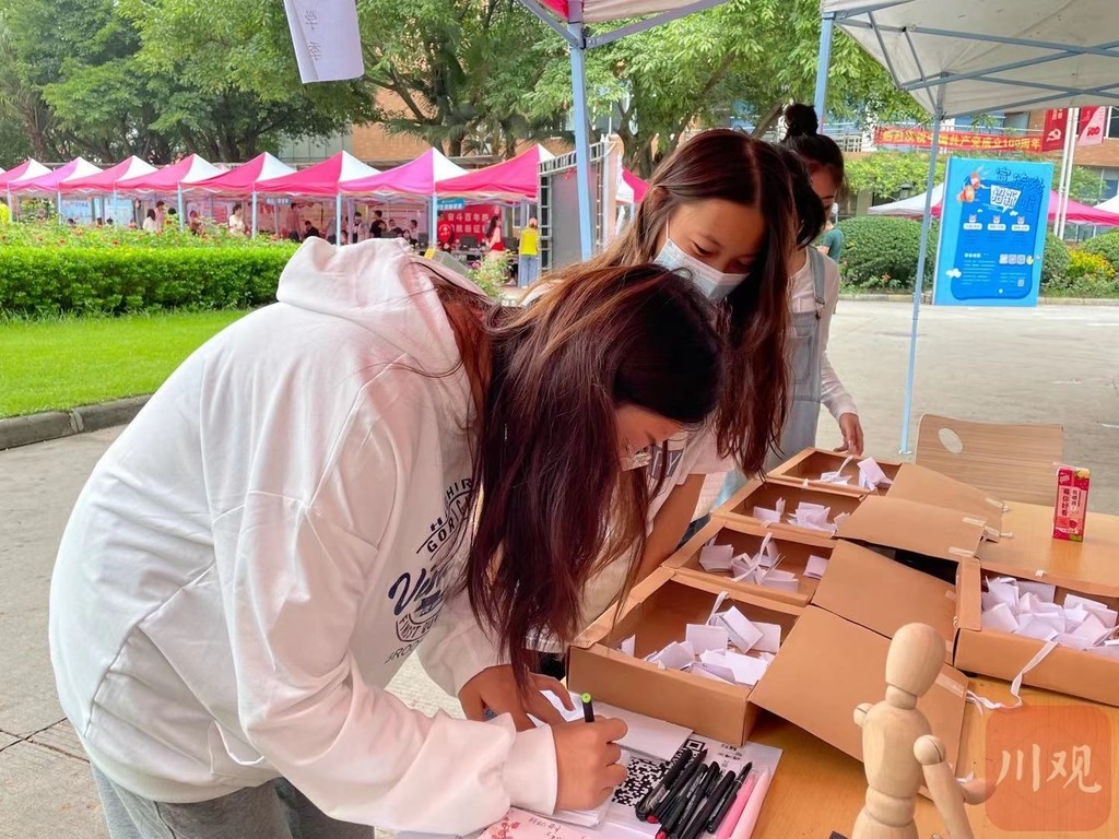 在崇州校区迎新现场,校团委点位前排起长长的队伍,每位新生可以领取一张祝福贺卡且随机抽取一张“盲盒”字条,还可以留下想问的问题,由学长学姐帮忙解答。“我们一共设置了衣食住行4个盒子,事先准备了500多个字条,策划这个小游戏是为了帮助新生了解学校、专业,在新生与新生、新生与老生之间产生互动”。社团联合会赵颖同学介绍说。同样在绵竹校区,欢快的流行歌舞、优雅的汉服表演也吸引了新生驻足围观。