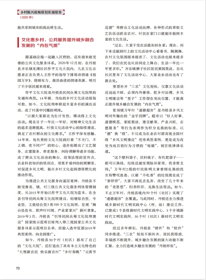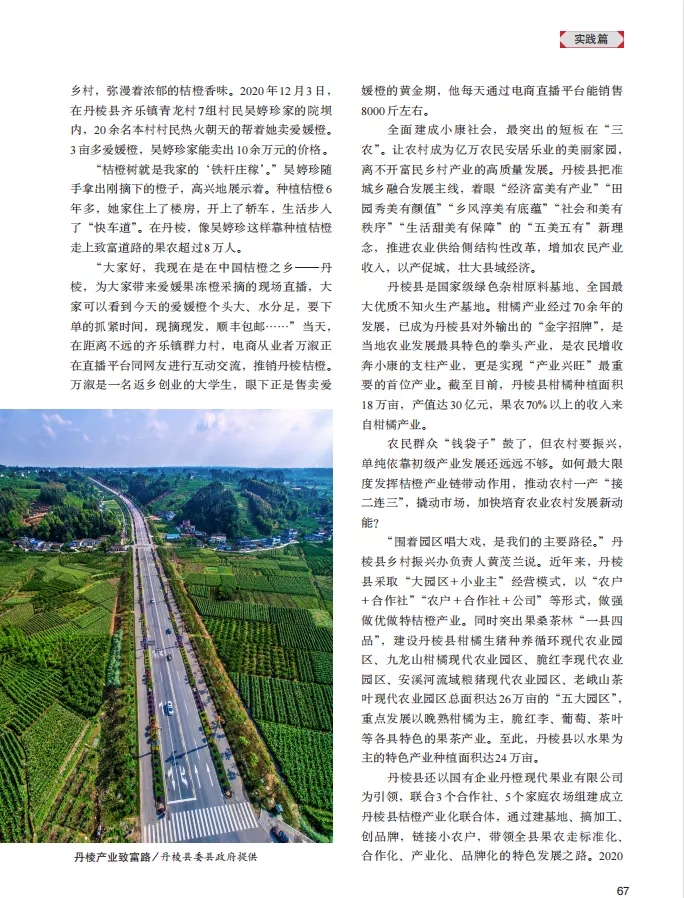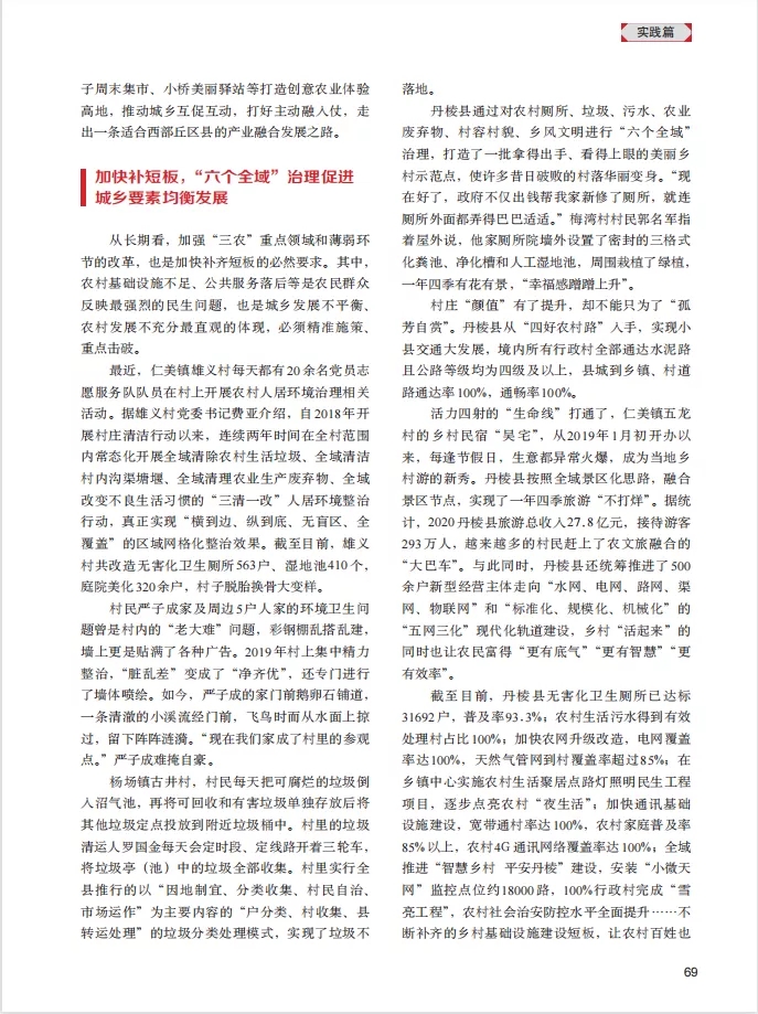 报告认为,丹棱县把农业农村放在了优先发展位置,围绕乡村振兴“二十字”总要求,坚持发展绿色产业,全域推进产村相融,完善基础设施,提升公共服务、抓实社会治理,缩小城乡差距,探索走出了一条西部丘陵地区产业主导、融合共进、均衡发展的乡村振兴之路。