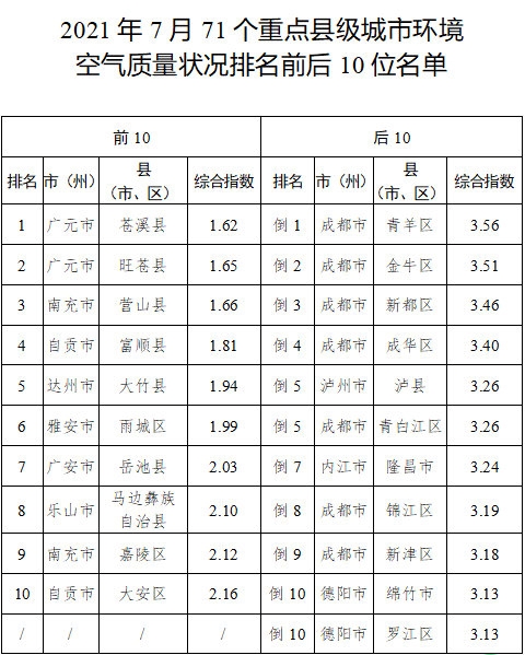今年7月,71个重点县级城市中,环境空气质量较好的前10名依次为苍溪县、旺苍县、营山县、富顺县、大竹县、雅安市雨城区、岳池县、马边彝族自治县、南充市嘉陵区、自贡市大安区;环境空气质量较差的后10名依次为成都市青羊区、成都市金牛区、成都市新都区、成都市成华区、泸县和成都市青白江区(并列)、隆昌市、成都市锦江区、成都市新津区、绵竹市和德阳市罗江区(并列)。