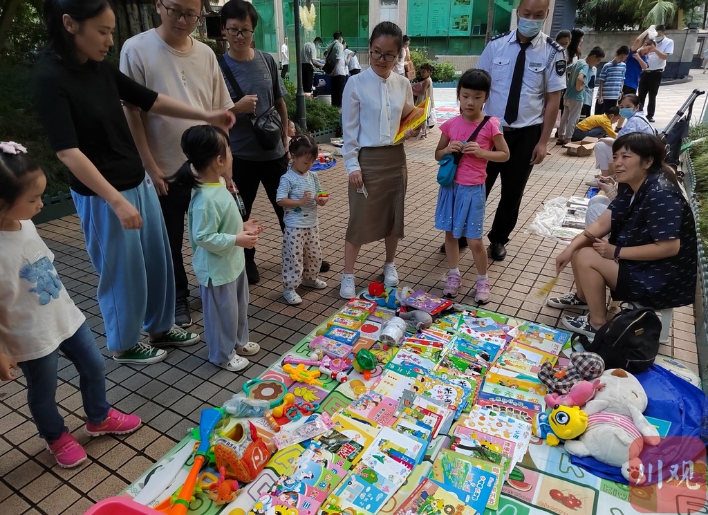 8月29日晚,成都市东光小区社区内的跳蚤市场热闹非凡。市场里,有不少小朋友们趁着暑期行将结束之时,带着自己的小人书、玩具及一些闲置物品,通过物品的交易与置换来体验通过商品交易带来的生活乐趣。