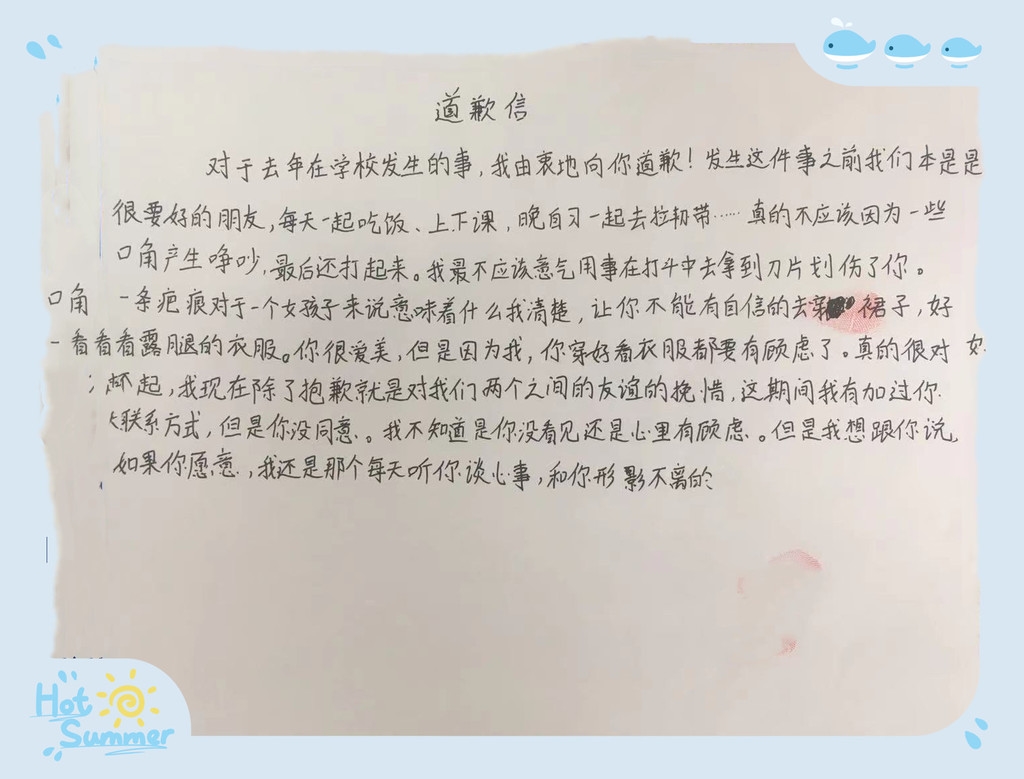 “我最不应该意气用事拿刀片划伤你,一条疤痕对于一个女孩子来说意味着什么我清楚,你很爱美,但是因为我,今后穿好看的衣服都要有顾虑了......”刘雪专门写了道歉信,希望能够得到王静的原谅,挽回两人的友谊。收到道歉,王静也悔不当初,口不择言刺激刘雪。
