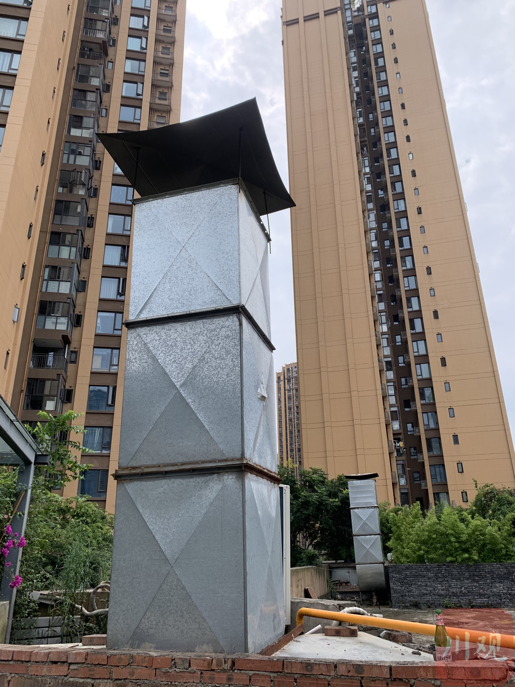 离餐馆不远处的屋顶上,记者找到了该片区的烟道排口。这里的烟道看上去比餐厅里的还新一些,“此前有群众反映楼顶烟道排口不符合规定,我们核查后也立即组织进行了技术性整改。”成都高新区生态环境和城市管理局相关人员说。