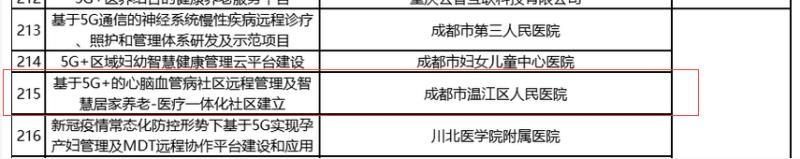 近日,工信部和国家卫健委公示“5G+医疗健康应用试点项目”名单,温江区人民医院超声医学科申报的《基于5G+的心脑血管病社区远程管理及智慧居家养老-医疗一体化社区建立》项目成功立项。