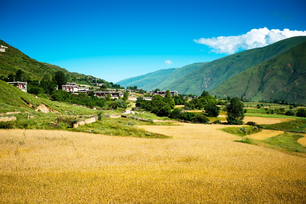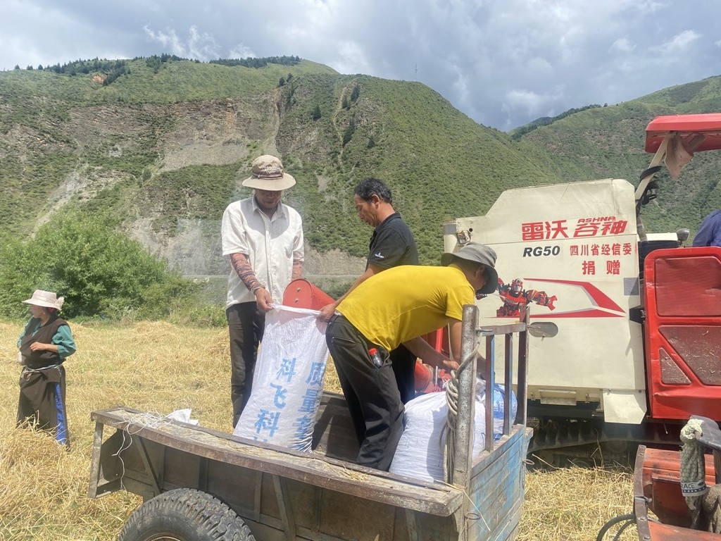 相隔20多公里外的鲜水镇新疆沟村,村民趁着晴好天气抢收麦子,跟着收割机的路线,收杆、装车、搬运……一派繁忙的丰收景象。尼玛泽绒手里捧起一大把新收的麦粒,放在鼻尖深深地嗅了嗅,满脸洋溢着丰收的喜悦,不停地感叹科技给农民带来的便利:“联合收割机不仅节省劳动力,还缩短了收割时间,真的是老百姓的福利!”