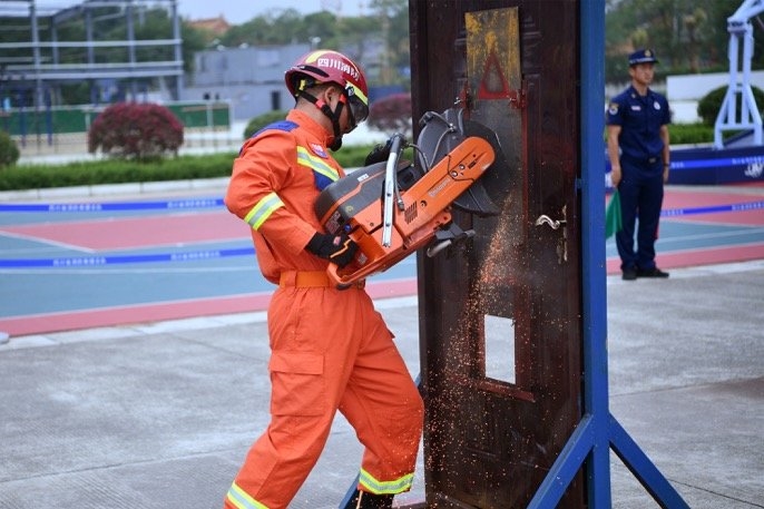 在应急救援员竞赛项目的演示中,参训队员展示了综合救助科目,该科目主要训练队员的破拆救援综合能力。该项目共设置了综合救助、水域救援和绳索救援三个科目比赛。