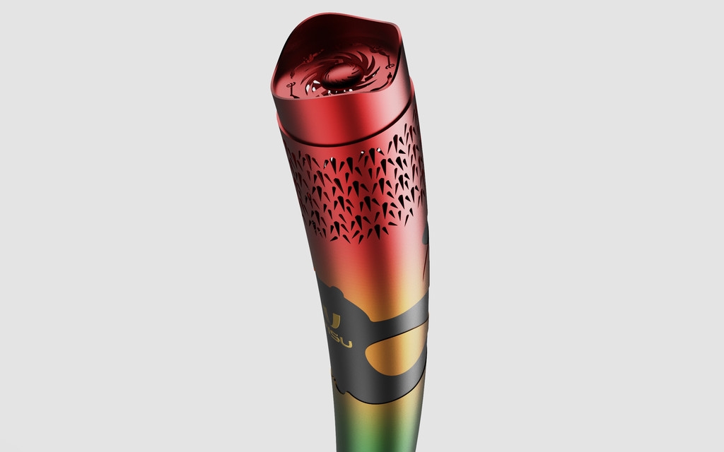 成都大运会火炬“蓉火”,取意成都的简称“蓉”,“蓉火”又寓“融合”之意。火炬顶部,成都城市形象标识、中国文化遗产标志主体图案太阳神鸟,在淬火中亮出弧线,勇敢追求光明,展现天府之国的深厚文化底蕴。