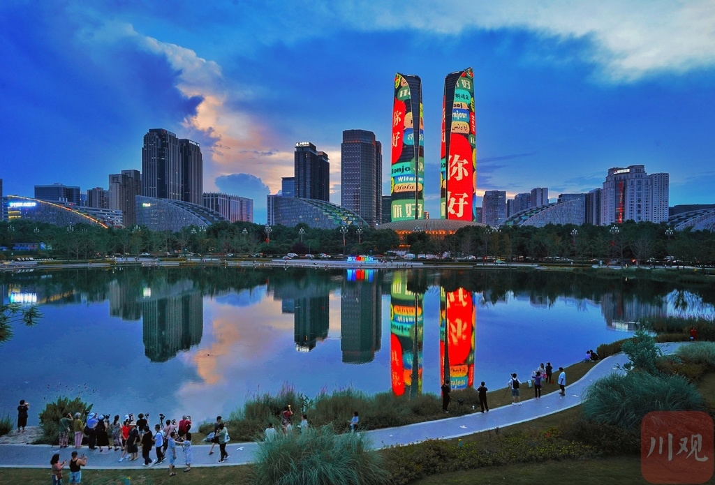 成都市双子塔倒映在交子公园湖里,蓝调的傍晚静谧温馨,如今这里已是成都新晋网红地标打卡地。