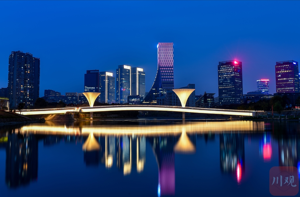 成都市高新区垮锦江人行天桥与欧洲中心、软件园灯光形成新景观。